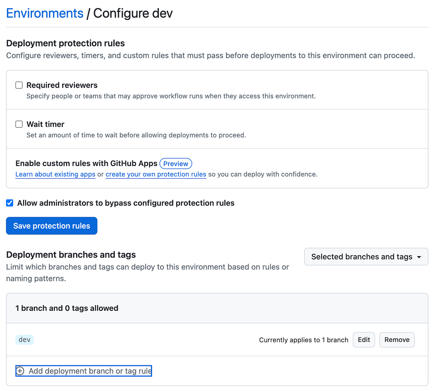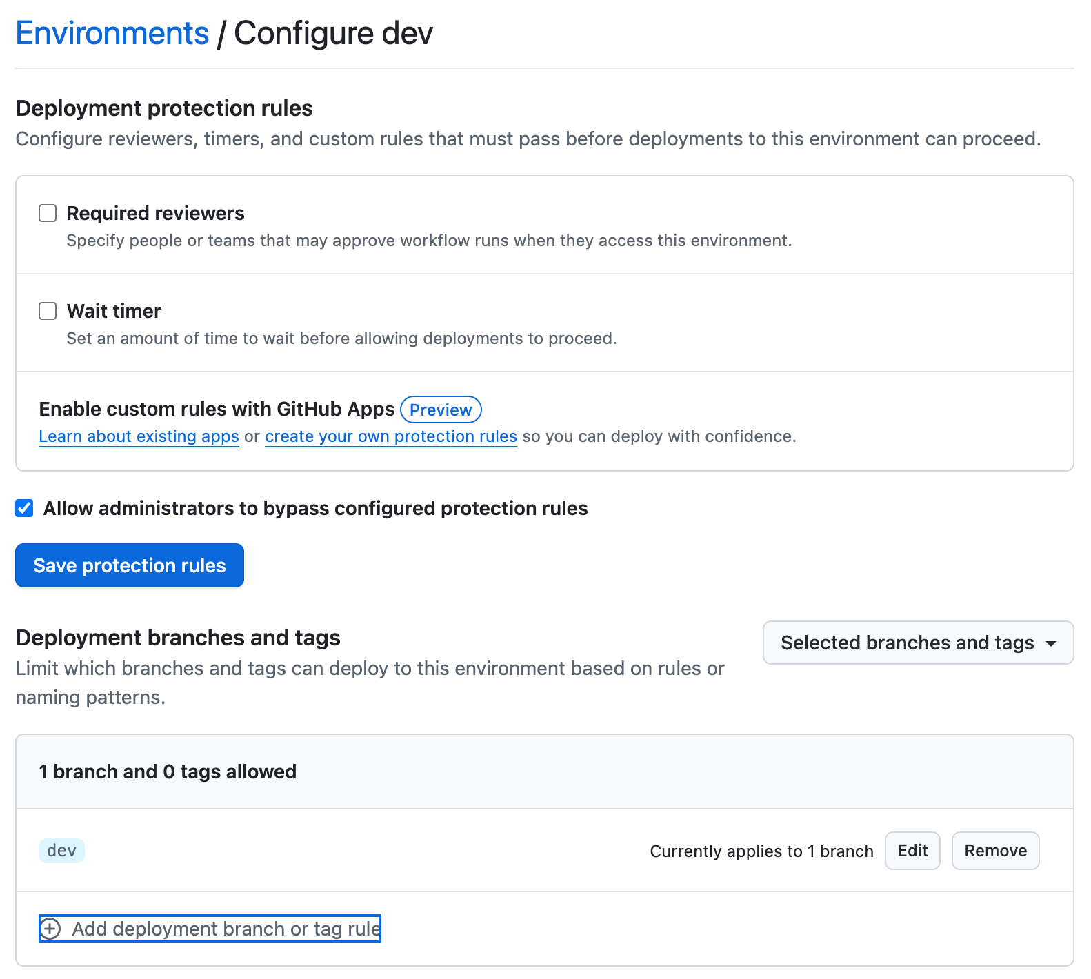 Creating branching rules for the deployment of the particular environment on GitHub.
