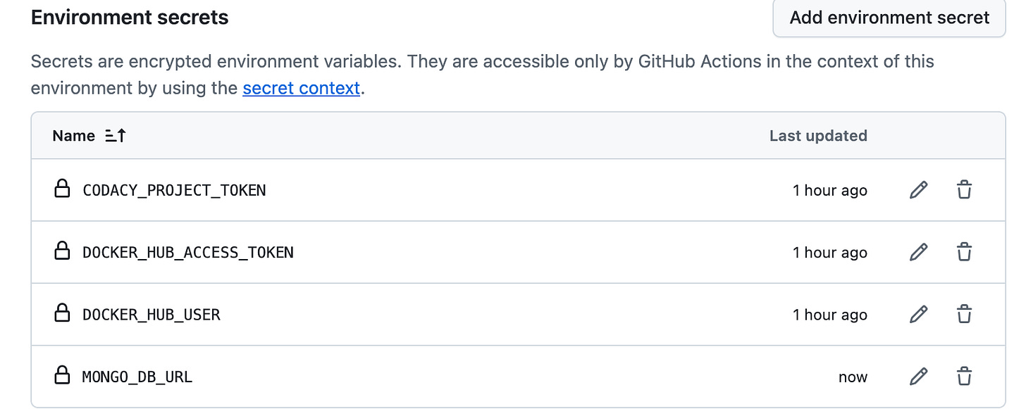 Let’s consider the app uses MongoDB as the datastore; it would require the environment-specific DB URL to connect to the MongoDB database. Here, we would add the MONGO_DB_URL as a secret to the GitHub environment to make it available for the job to access the secret value and set it as a build arg while building the Docker image.