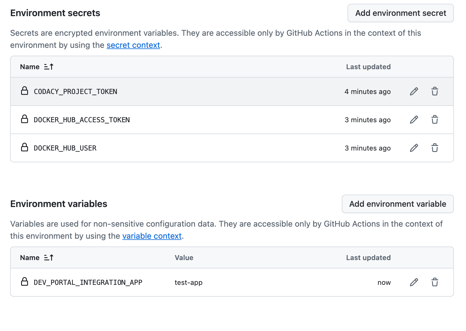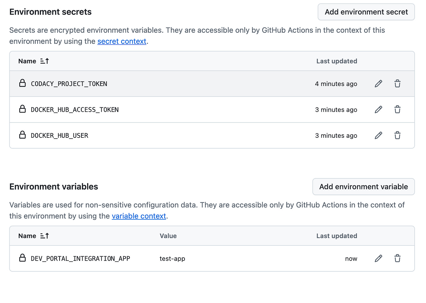 To create environments on GitHub, navigate to your repository's Settings tab and then to Environments. The sample below shows that a development environment has been added with a few secrets and environment variables.