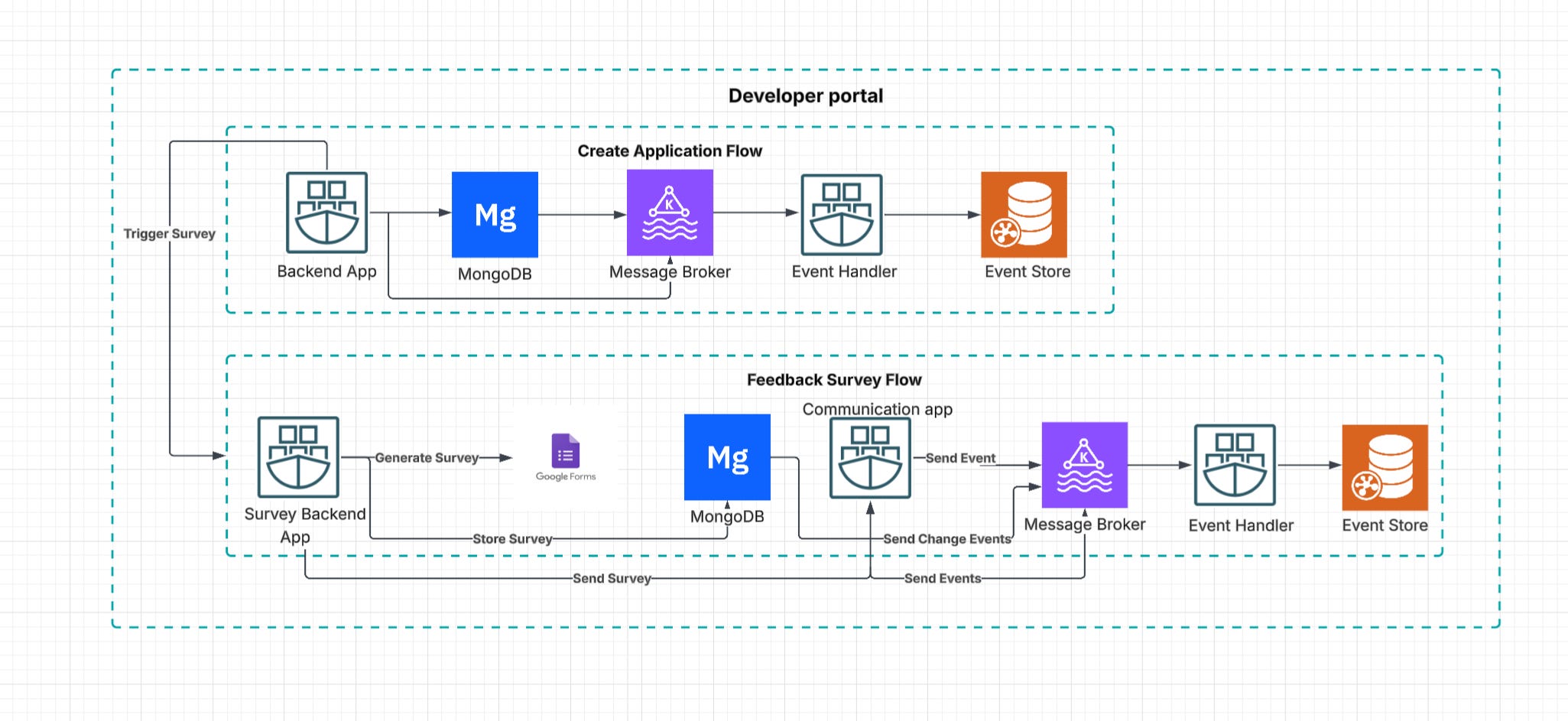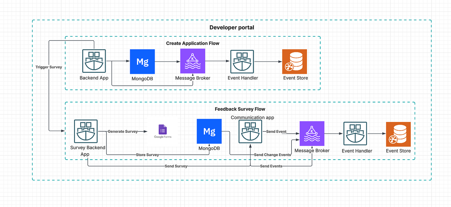 As in the process flow, the create application backend triggers a survey business process; here, the trigger is “paid subscription model for more than 3 months”. The survey app creates a Google Form survey and stores the survey details in the datastore. Further in the process, the survey link is sent to the respective application owner, providing an opportunity to provide feedback. This process flow generates a few events, which are valuable to the business in closing the feedback loop by incorporating feedback into change requests for improvement (if required) on the current API products or pushing for new features.