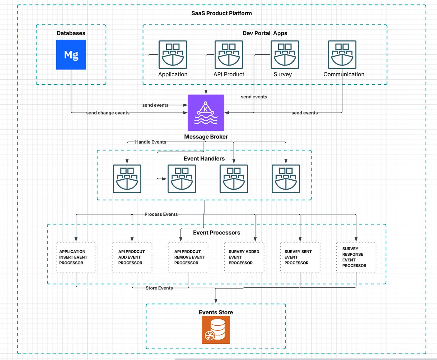 As mentioned in the preceding sections, all events generated on the SaaS platform have specific event handlers and processors that handle and store events in the event store. The diagram below gives an understanding of how the events for different domain objects on the SaaS platform could be handled and processed.