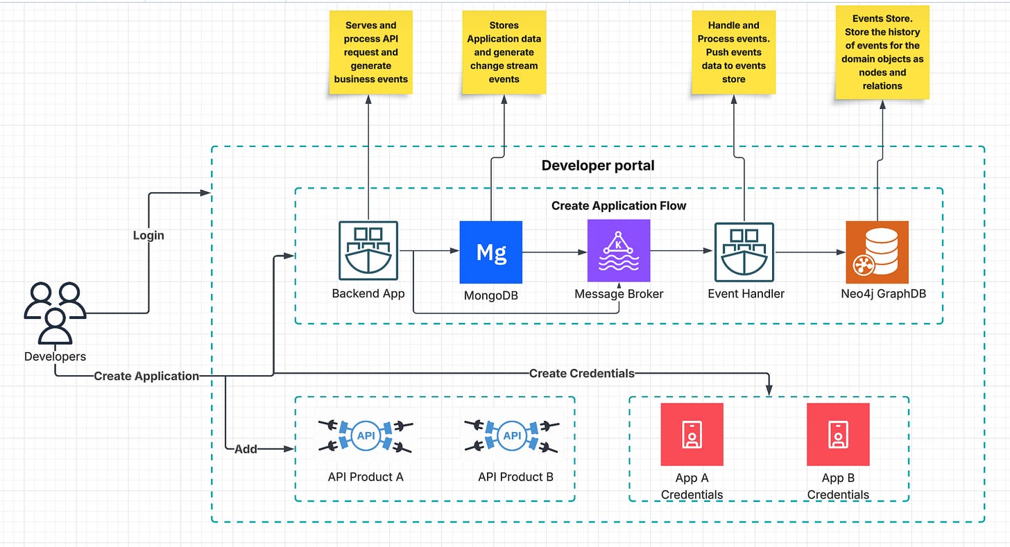 A developer portal Application could involve many different business processes, which could generate events at each stage of the business process transaction. Let’s list a few of them below, with some examples of the business process flow for some of them.